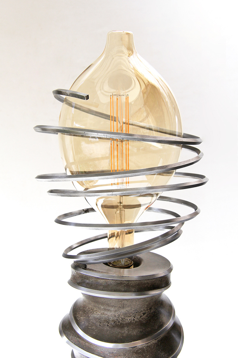 L'ensemble de la forme de cette lampe est guidé par une longue spirale d'acier, libre et aérienne. Une matrice de béton vient la figer, mais aussi la révéler. La ligne de fer se libère du béton, devenant cage de lumière.