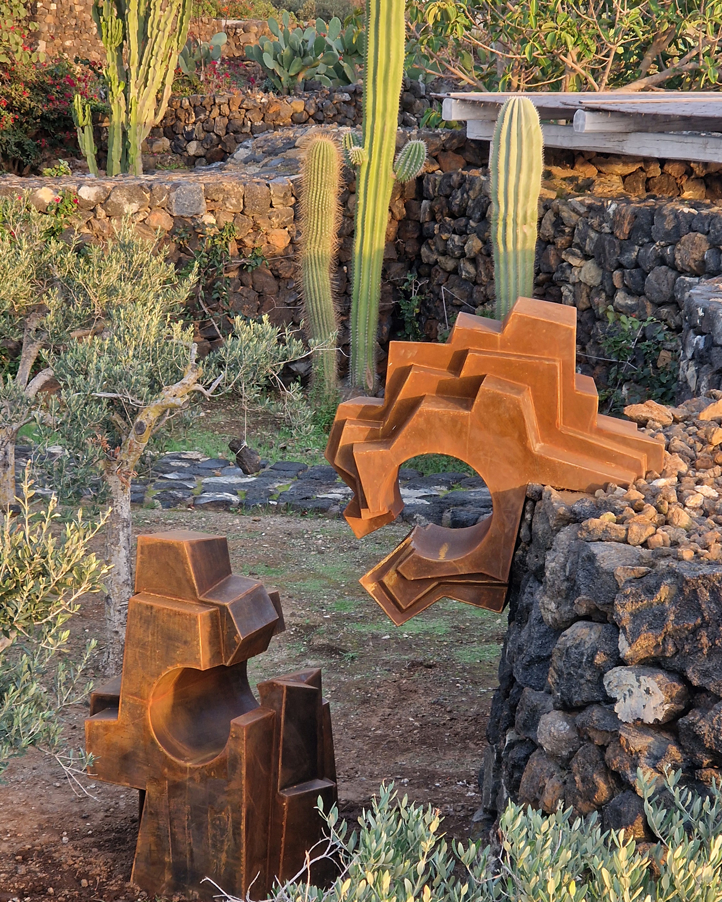 Quant aux 2 cercles qui transpercent les sculptures, ils font référence aux incroyables "jardins Pantescu", véritables donjons de pierres sèches qui abritent les agrumes, les protégeant du vent comme du froid nocturne en hiver. Ils condensent aussi l'eau de la brume pour apporter un peu de fraîcheur aux arbres, la pluie est si rare.